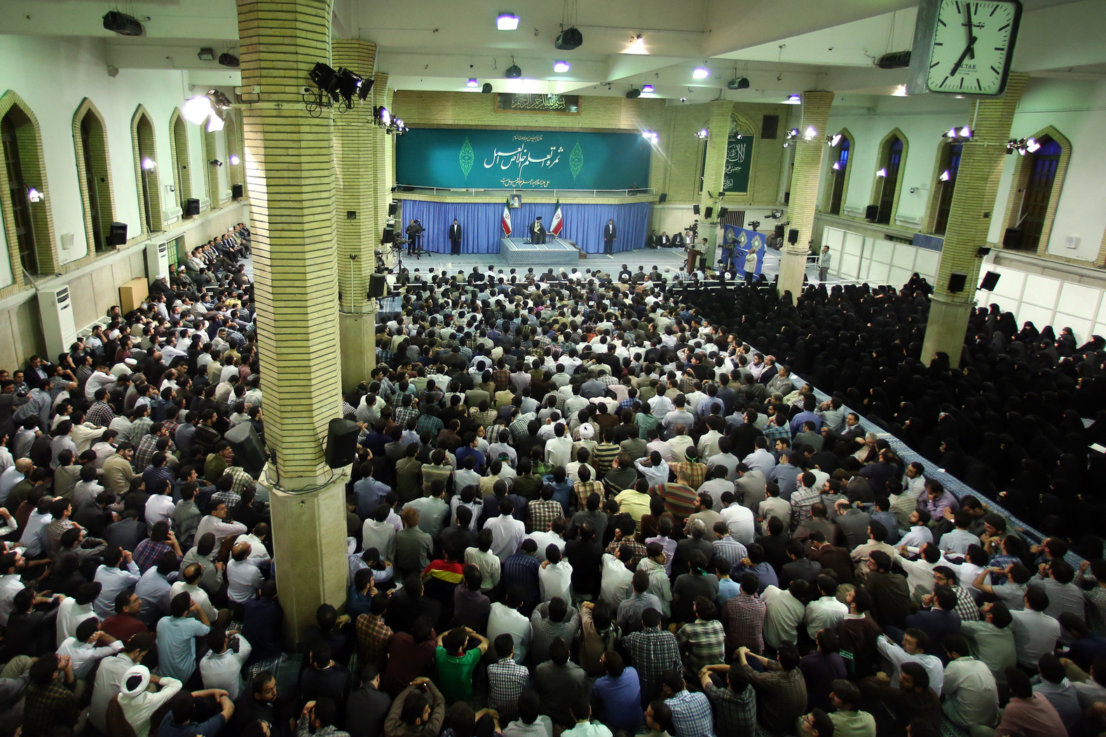 از مصلی خارج می شوم و با موتور یکراست می روم به سمت خیابان فلسطین. موتور را در گوشه ای می گذارم و وارد گیت بازرسی می شوم. هنوز نمی دانم میهمانان این دیدار چه کسانی هستند و موضوع دیدار چیست. ولی لابه لای جمعیت تعدادی از مسئولان نظام را می بینم. بعد از عبور از چند گیت بازرسی و تحویل کفشها وارد حسینیه می شوم. همان ابتدا میهمانان با کیک و شربت پذیرایی می شدند.لابی ورودی را دور می زنم و درست زیر ساعت بزرگ حسینیه می نشینم.